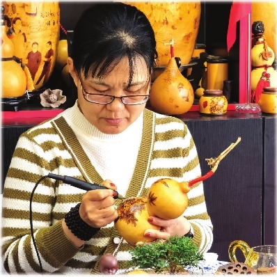 房恩岺:我是从2019年开始接触葫芦烙画的,我家是咱天津市滨海新区大港太平镇的。当时是我师傅徐林成在我家附近办了一个葫芦烙画培训班,当时是免费学习。我一开始就是好奇来试试,结果一学就被迷住了,我觉得多学一门手艺,多一个爱好,总是好的。业余学习了一段时间之后,我对这项非遗有了更深的了解,觉得这个产业是有前景、有发展的,就把工作辞了进行专业学习。
