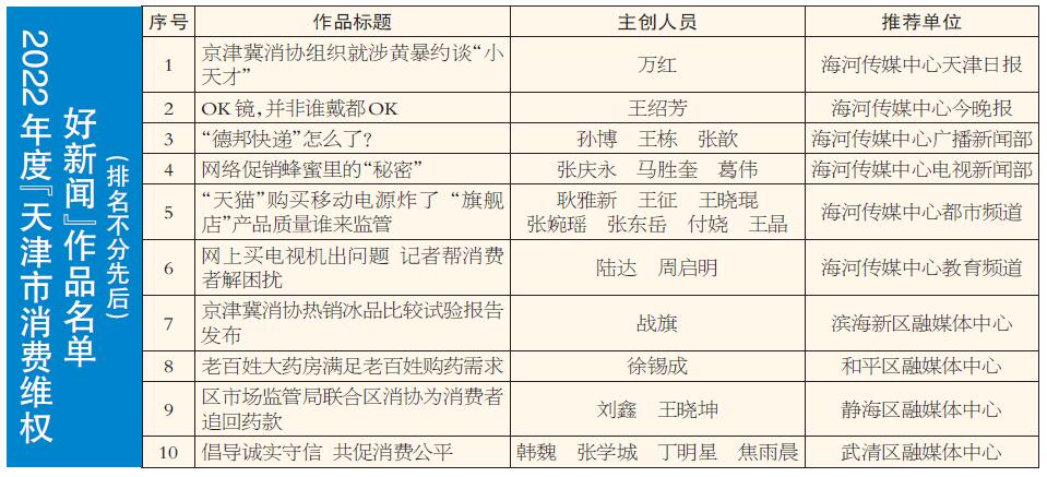 本报讯(记者 张雯婧)2022年度“天津市消费维权好新闻”评选昨日揭晓,10件新闻作品榜上有名。