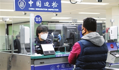 图为3月15日,在深圳罗湖口岸入境检查大厅,罗湖边检站民警为外国旅客办理入境手续。 新华社发