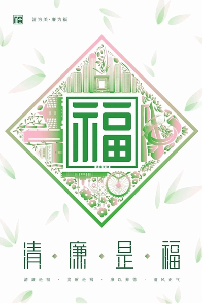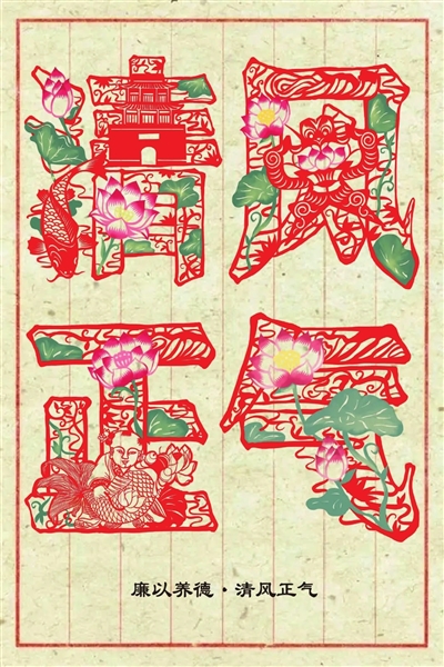 还有一类作品则对天津文化进行了充分挖掘。无论是杨柳青年画、鼓楼、风筝等传统元素,还是桥梁、建筑等现代城市景观,都在作品中巧妙地与清廉主题实现了联动。在海报设计作品《剪纸清廉》中,“廉以养德,清风正气”八个汉字以传统剪纸的样式呈现,并在字体中融入了杨柳青年画的娃娃和鱼、传统风筝、天津之眼、解放桥等形象。作者、天津美院学生张清扬告诉记者,创作前,她认真搜集和研究了自己熟悉的天津文化符号,选出其中适合表现清廉主题的再加以反复打磨,以符合剪纸的表现形式。她表示,此次创作经历让她更加确立了艺术要从生活中取材的创作理念。