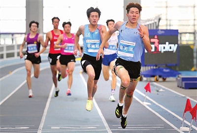 昨天,全国室内田径锦标赛在天津团泊体育中心进行首日比赛。天津队选手鞠天淇(右一)在男子400米预赛中,以47秒79的成绩晋级半决赛。 新华社发