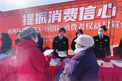 为进一步营造放心消费环境,河西区多部门联合开展“提振消费信心”3·15国际消费者权益日主题活动。区市场监管局工作人员进行有关法律、法规和政策的宣传,发放各类宣传材料,展示假冒伪劣商品,为群众释疑解惑。