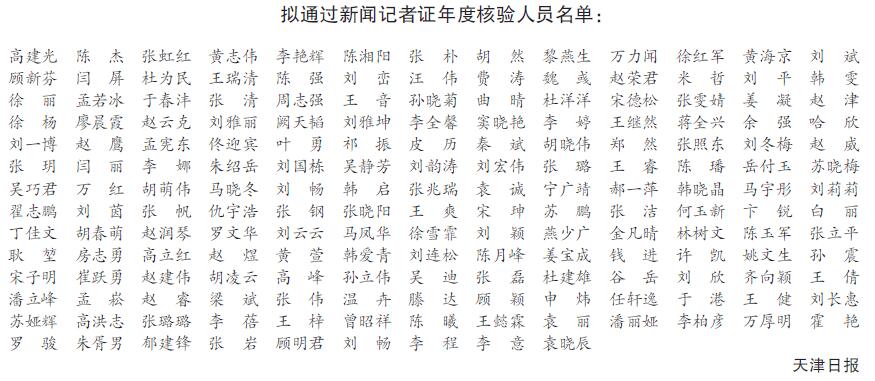 根据《新闻记者证管理办法》、国家新闻出版署《关于开展2022年度新闻记者证核验工作的通知》以及天津市新闻出版局相关要求,我单位已对持有新闻记者证人员资格进行严格审核,现将拟通过新闻记者证年度核验人员名单予以公示。公示期:2023年3月17日至3月23日,监督电话:022-23603290。