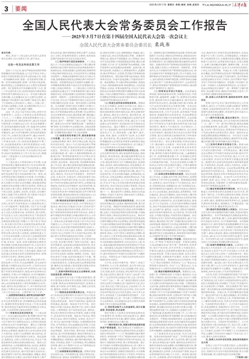 (一)做好宪法实施和立法工作。推进合宪性审查制度化、规范化,完善和加强备案审查制度,维护宪法和基本法确定的特别行政区宪制秩序。坚持一个中国原则和“九二共识”,推动两岸关系和平发展,坚定不移推进祖国统一大业。发挥人大在立法工作中的主导作用,研究编制十四届全国人大常委会立法规划,统筹安排未来五年立法工作。健全社会主义市场经济法律制度,推动构建高水平社会主义市场经济体制。加快推进科技、民生、社会、文化、环保、安全、国防领域立法。统筹发展和安全,为推进中国式现代化提供法律保障。