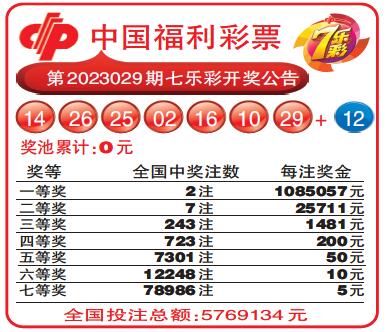 中国福利彩票第2023029期七乐彩开奖公告