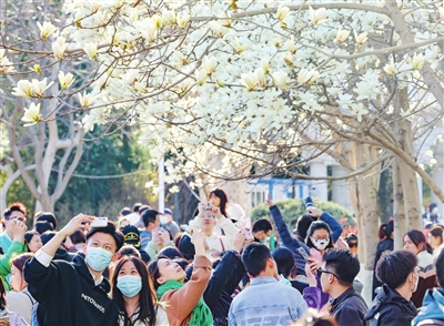 昨日,我市气温回升,迎来晴好天气。睦南公园盛开的玉兰花吸引不少游客观赏、拍照。