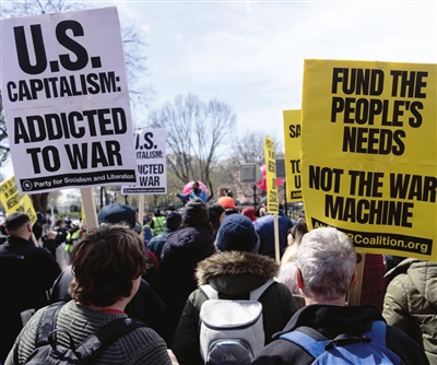抗议者举着写有“对美国无休止战争说不”“停止战争拨款”“修建学校而不是制造炸弹”等反战标语的纸板或海报,不时齐声高喊反战口号。