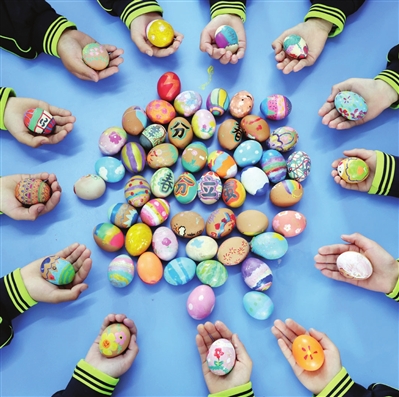 3月20日,在山东省枣庄市江山实验学校,小学生们在展示绘制的“彩蛋”。3月21日是春分节气。这一天,我国民间有立蛋习俗。新华社发