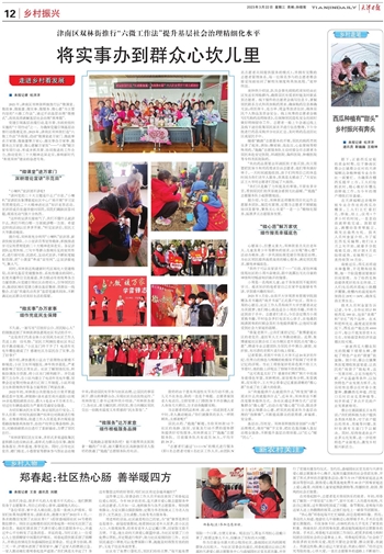 党建引领基层治理行动,是市委、市政府组织实施的“十项行动”之一。为确保党建引领基层治理行动落地见效,2023年,津南区双林街打造“六微工作法”升级版,启动“微课堂进万家门、微故事系万家情、微能量聚万家心、微实事办万家事、微服务达万家意、微心愿解万家忧”──“六微”暖万家专项行动,形成齐抓共管、协同推进的工作合力,推动党的二十大精神走深走实,奏响新时代“和美双林”建设的奋进号角。