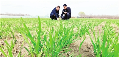 图为北辰区双街镇农技人员深入麦田查看土壤墒情和小麦长势。