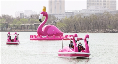 昨日,水上公园新引进的30条“网红”游船──火烈鸟游船面向游客开放,游客驾船可与湖心高6米的火烈鸟浮岛互动。