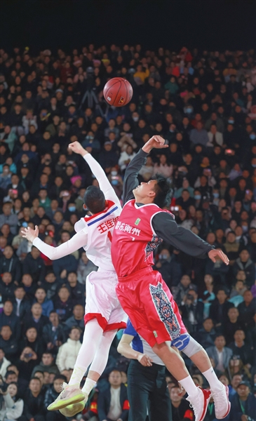 3月25日,黔东南队球员解涛(右)和铜仁队球员王连波在比赛中跳球。