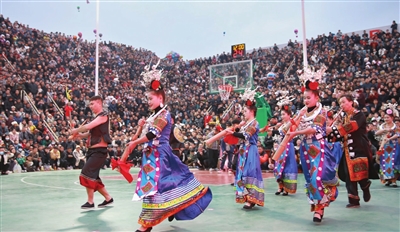 3月25日,演员在铜仁队与黔东南队的比赛开始前表演节目。