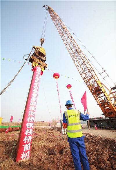 本报讯(记者 万红 摄影 记者 张磊 通讯员 徐辉)记者从中铁十八局集团了解到,日前,由该集团五公司负责施工的国内在建单跨最大、桥面最宽的下承式简支提篮钢箱系杆拱桥──滨海新区西中环快速路跨海河桥工程钢栈桥首桩深扎入地,标志着该工程建设进入快车道。该工程建成后,将极大提高滨海新区南北向道路通行能力。