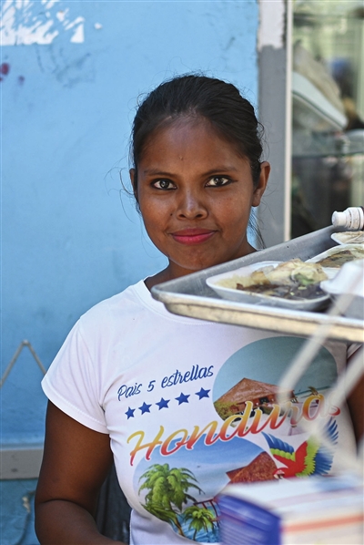 一名女子在洪都拉斯首都特古西加尔巴的一处街道上售卖小吃。