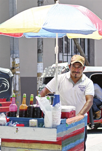 一名男子在洪都拉斯首都特古西加尔巴的一处街道上售卖小吃。