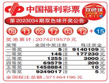 中国福利彩票第2023034期双色球开奖公告
