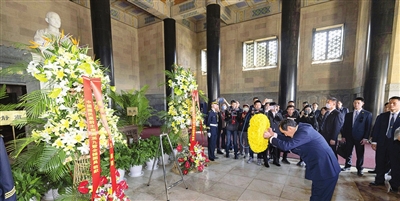 上午9时许,马英九一行抵达中山陵博爱广场,一路拾级而上,进入祭堂。面对孙中山先生石刻坐像,马英九一行静默肃立。司仪宣布祭祀典礼开始,马英九向坐像敬献花环。
