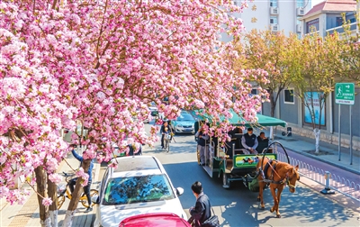 随着和平区“首届海棠花赏花季”临近,五大道街区内海棠花竞相开放。其中,大理道上盛开的海棠更是吸引不少市民前来拍照、打卡。 本报记者 吴迪 摄