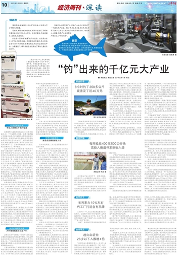 伴随钓鱼人群不断扩大,钓具产业如今已经形成了一个庞大的产业链。除了竿、钩、轮、线、饵、网、箱、灯等,还有一大批与之相关的户外用品涌现出来。有业内人士测算,钓具产业目前整体产值已迈上“千亿元级”。