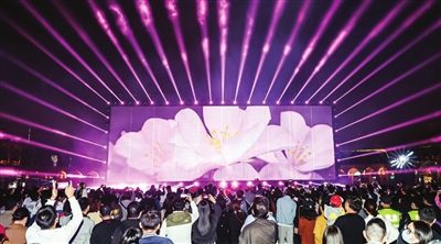 灯光秀未息,激光投影再次将观众拉入梦幻仙境。海棠花仙子玉衡出现在空中,一袭花衣的她带领观众穿越古今、纵览民园、畅游和平,飞过无垠星河、飞过斑斓自然、飞过风情万种的和平区,这里海棠盛开,春意烂漫。观众们置身其间,恍若在花海中“穿越时空”,大家一边鼓掌,一边惊呼“太美了!”“太震撼了!”