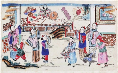 放风筝是清明节人们最喜爱的活动之一。天博馆藏清代光绪版的杨柳青年画《放风筝》是一幅三裁年画。三裁是将一张粉连纸裁剪三次而得到的年画用纸,尺寸纵横为35厘米×60厘米左右。这幅年画以放风筝这种娱乐活动为主题,突出人物形象。画面共绘有8个人物,每个人手里都牵着一只风筝,风筝的种类涵盖了硬翅、软翅、拍子、串活等多种类型。
