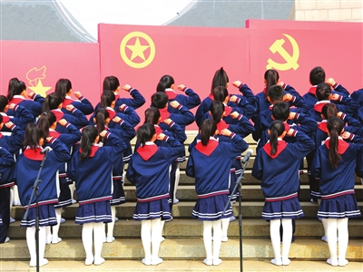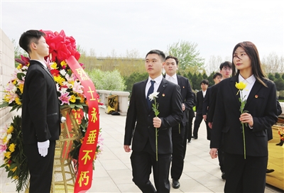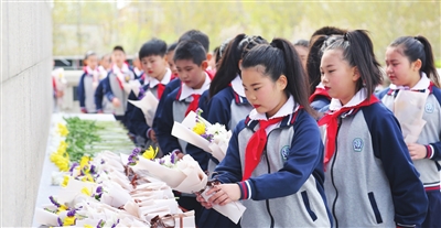 昨天,天津市青少年清明祭英烈主题团(队)日活动中,中小学生和青年代表在市烈士陵园向人民英雄纪念碑敬献鲜花。 本报记者 王倩 摄