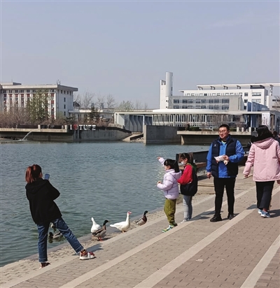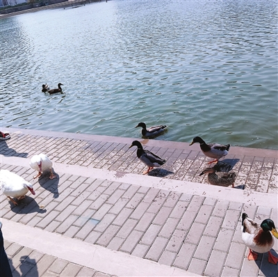 学校保安介绍,这群野鸭在这里栖息十几年了,最初只有几只,因为人们的爱护,它们就留下来不走了。每年都有新的野鸭繁殖并在这里长大,一来二去,就成了现在这么大的群体。