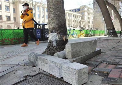 河西区解放南路与南京路交叉口东莱里小区一侧,记者看到两个阻车桩倒卧在人行道的树坑中,一辆机动车停在人行道上。小区居民霍女士告诉记者,“这个桩子本来就不太牢固,有些人为了停车就弄成这样,现在也没人修复。”