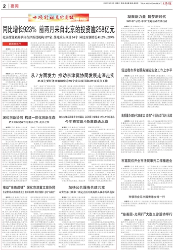 本报讯(记者 岳付玉)昨天,我市举行“十项行动·推动京津冀协同发展走深走实行动方案”新闻发布会。会议发布了一组令人振奋的数据:今年1—2月,北京投资来源单位在津新设机构137家,落地重大项目34个、总投资258.8亿元,同比分别增长41.2%、209%和923%。三地协同发展呈现出全新格局。