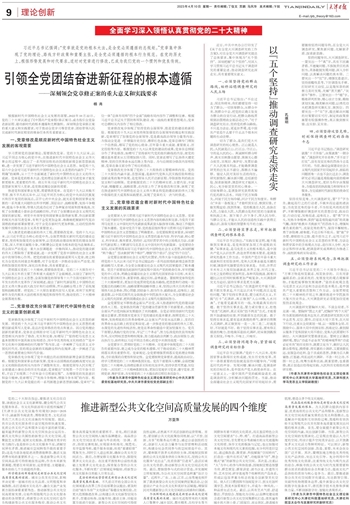 党的二十大报告指出,要推进文化自信自强,铸就社会主义文化新辉煌,健全现代公共文化服务体系。市文化和旅游局日前组织编制了《天津市公共文化设施布局规划(2021—2035年)》,涵盖图书阅读类、博物展览类、文化活动类共三大类公共文化设施的布局规划。据此,我市公共文化服务将日益呈现持续快速发展、优质公共文化产品和服务日趋丰富的新局面,越来越多的新型公共文化空间也会应运而生。兼具文化和公共属性的新型公共文化空间,是聚拢艺文资源、延续文化根脉,重塑城市美学的有力践行;也是弥补公共文化服务不足,消解空间异化矛盾,推进城市空间转型升级的重要手段;还是当前各地促进消费潜能释放,激活文旅消费市场的重要抓手之一。推进新型公共文化空间高品质可持续地良性运转,作为未来新发展课题,需要在布局谋划、运营管理、主题建设、服务供给几个方面提档升级。