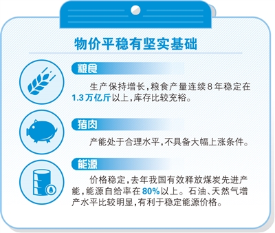 国家统计局新闻发言人付凌晖表示,我国粮食生产保持增长,粮食产量连续8年稳定在1.3万亿斤以上,库存比较充裕;猪肉产能处于合理水平,不具备大幅上涨条件;能源价格稳定,去年我国有效释放煤炭先进产能,能源自给率在80%以上。近些年,石油、天然气增产水平比较明显,有利于稳定能源价格。