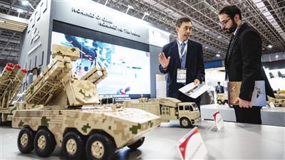 中国北方工业有限公司(北方公司)展台的工作人员(左)为参观者介绍展品。 新华社发
