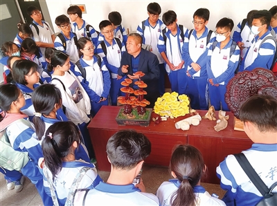 图为我市“头雁”项目首批学员、蓟州区出头岭镇中峪村食用菌种植户戴建良向参加学农活动的学生讲解菌菇知识。