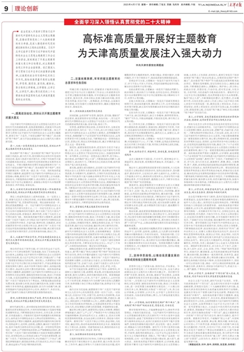 理论的价值在于指导实践,学习的目的全在于运用。新时代十年天津发展取得了显著成就,发生了历史性变革,这从根本上说都是习近平新时代中国特色社会主义思想科学指引的结果,是习近平总书记对天津工作提出的“三个着力”重要要求领航定向的结果。新征程上,天津要坚定不移沿着习近平总书记指引的方向阔步前行,开创全面建设高质量发展的大都市、高水平改革开放的大都市、高效能治理的大都市、高品质生活的大都市的新局面。高标准高质量开展好主题教育,就是要把习近平新时代中国特色社会主义思想转化为坚定理想、锤炼党性和指导实践、推动工作的强大力量,从党的创新理论中汲取拼搏奋进的智慧和力量,激励广大党员干部奋发有为干事创业,不断提高推动高质量发展本领、服务群众本领、防范化解风险本领,加强斗争精神和斗争本领养成,提振锐意进取、担当作为的精气神,紧紧围绕新时代新征程党的中心任务,真抓实干、务求实效,以新气象新作为推动天津高质量发展取得新成效。