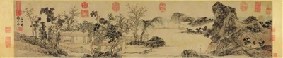 天博馆藏明代文徵明的《林榭煎茶图》卷,描绘了一派春和景明的江南风光,窗外春华锦绣、屋内春茗幽香。画卷左侧绘不高不矮土坡山石,在坡岸上长满了杂木和丛草,葱葱郁郁,春光明媚,正是煎茶的最好时节。画卷右侧用淡花青、赭石色染后,干笔皴擦堆砌了一座小山,山前一人拄杖沿小径而行,似去访友。他前面是开阔的湖景,向左有一简易小桥连接平缓的坡岸,画中央工笔细线勾勒出竹篱围成的院落,各色杂树形成林榭掩映着数间茅屋,穿红衣主人凭窗远眺似在等待友人,一小童在室外烹茶。该图卷构图起伏跌宕,疏密相间。画家以牛毛皴、解索皴技法来展示南方山石的结构和纹理,又以“个”字、“介”字、圆点笔法来体现林榭的丰富与茂盛。整体画面清新、素雅、明亮、幽静,表现了文人悠闲、恬淡的生活情趣。