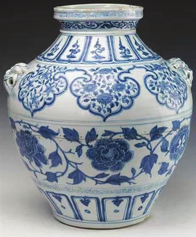 作为中国古典吉祥纹样,牡丹花也经常出现在瓷器上。天博馆藏元代青花缠枝牡丹纹狮耳罐,盘口,短颈,鼓腹,形体饱满,腹上端贴塑两个狮头形耳。通体白釉,釉下用青花分层绘出回纹、卷草纹、变体莲瓣纹、如意云头纹,腹部以缠枝牡丹纹为主题纹饰,虽纹饰层次多达七层,但主次分明,繁而不乱。天博器物研究部副主任李君介绍:“此罐造型古朴,高大丰满,有雄浑的气势,属元代青花之精品。”