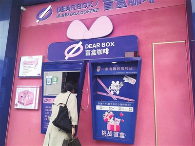 与一般的连锁咖啡店不同,DEAR BOX盲盒咖啡(简称盲盒咖啡)滨江道店颇具神秘感──蓝色、粉色是这家门店的主色调,两个大的咖啡杯造型是外观设计的核心元素,点单窗口与盲盒样式的取餐口分别嵌入其中。对消费者来说,您很难看清店内布局情况。尽管可以选择咖啡或茶饮,也可以选择冰或热,但在下单后,您依然不知道最终会拿到哪种口味的咖啡或茶饮。