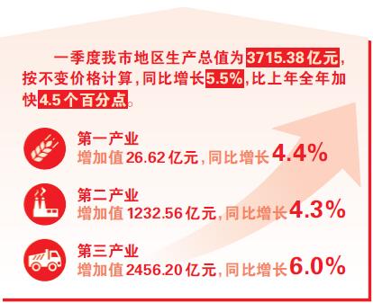 根据地区生产总值统一核算结果,一季度我市地区生产总值为3715.38亿元,按不变价格计算,同比增长5.5%,比上年全年加快4.5个百分点。分产业看,第一产业增加值26.62亿元,同比增长4.4%;第二产业增加值1232.56亿元,同比增长4.3%;第三产业增加值2456.20亿元,同比增长6.0%。