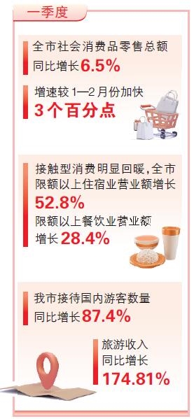 日赏花海,夜游海河,逛繁华商圈,品地道美食,吃住行游购娱多点发力,消费市场持续火热。根据市商务局的监测数据,我市320家重点商贸流通企业一季度整体销售额增长了11.1%,各大商圈销售基本恢复至新冠疫情发生前水平。同期,我市接待国内游客数量和旅游收入分别实现了87.4%和174.81%的同比增幅。