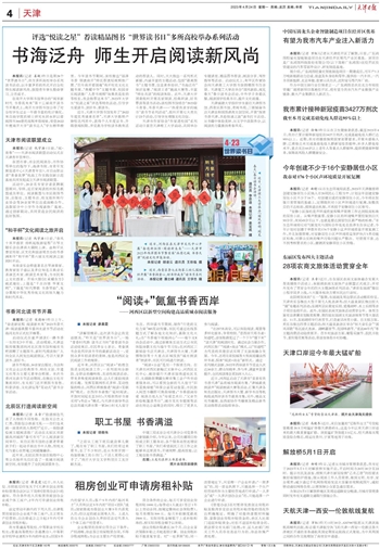 “阅读+公益”是另一个探索方向。在天津市河西区新梅江文体中心、河西区文化中心、廊坊银行天津宾馆南道社区支行、太湖路街博疆生鲜市集工会户外劳动者服务站,可以看到全新的无人值守“旧书置换绿植”环保公益互动装置,市民放入闲置书籍即可换取绿植;“书香浸润母爱 阅读点亮人生”母爱艺术日、“父亲节彩绘帐篷读书日”、城市文化专题展等活动在传达公益理念的同时,吸引了更多人参与阅读。