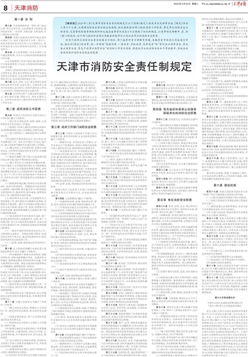 【编者按】:2020年1月《天津市消防安全责任制规定》(以下简称《规定》)在我市正式颁布实施。《规定》共分八章六十七条,从明确消防安全责任制总体原则、细化各级政府部门组织消防工作职责、界定单位消防安全主体责任、完善督促检查考评机制和加大违法违章责任追究5个方面做了细化和规范,以清单形式明晰市、区、街(镇)3级政府,38个部门组织和具有公共服务职能单位以及社会单位的消防安全职责。