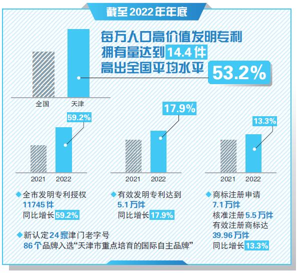 截至2022年年底,全市发明专利授权11745件,同比增长59.2%;有效发明专利达到5.1万件,同比增长17.9%;每万人口高价值发明专利拥有量达到14.4件,高出全国平均水平53.2%;2022年商标注册申请7.1万件,核准注册5.5万件,有效注册商标达39.96万件,同比增长13.3%;新认定24家津门老字号,86个品牌入选“天津市重点培育的国际自主品牌”。