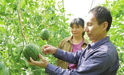 桑梓镇喜之园家庭农场内,王英锋和贾彩凤正在查看西瓜成熟情况。