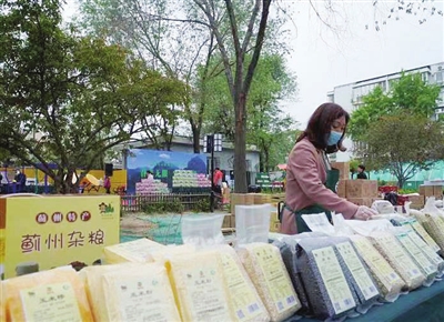 蓟州今年正实施“农品进京”工程,图为蓟州农品市集走进北京市交东社区荷园。