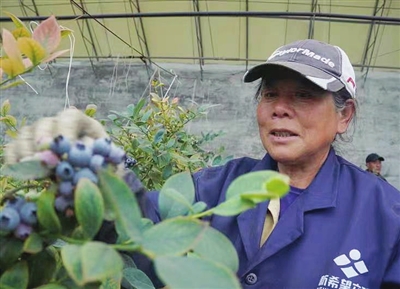 马伸桥镇汇丰蓝莓种植园区内,工作人员正在采收成熟的蓝莓。