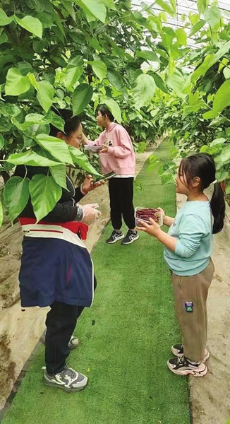 “这儿的桑葚好长呀!”看到大棚里手指长的紫色桑葚,小朋友们很好奇。