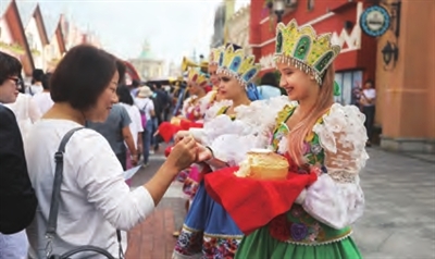 为进一步提升游客游览体验,航母主题公园的俄罗斯文化风情街将全新亮相,典型的欧式建筑搭配明艳亮丽的彩色涂装,营造一步一景的俄式风情。与往年不同的是,景区专门安排了俄式欢迎礼──“面包蘸盐”。身着盛装的俄罗斯姑娘将手捧大列巴面包,在入口处迎接每天的第一批入园游客,正所谓“不出国门便入俄境”。为契合“劳动节”主题,景区设有创意互动区,包括拍照墙、手印墙、绘画涂色墙,游客可在此共绘劳动之美。