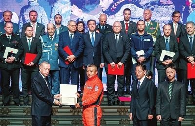 图为在土耳其安卡拉,土耳其总统埃尔多安(前左一)向中国救援队副队长王墨(前左二)颁发奖章。