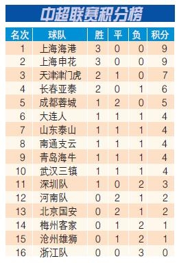 昨天进行的本轮另外4场比赛,上海海港队客场1:0战胜沧州雄狮队,上海申花队主场1:0战胜长春亚泰队,南通支云队主场1:0战胜河南队,大连人队主场0:0与成都蓉城队战平。前3轮比赛结束后,上海海港、上海申花两队均取得了3连胜,同积9分排名积分榜前两位,津门虎队积7分排名第3位,这是球队历史上近10多个赛季以来的最佳开局。